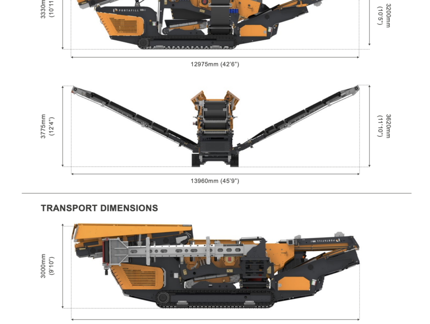 – rok produkcji 2017 – 550h – waga 14t – silnik Deutz 75KM – pokład 2,7×1,2m – wydajność do 200t/h – pojemność skrzyni załadowczej 5m3 – wymiary transportowe: 993cm x 309cm 260cm |